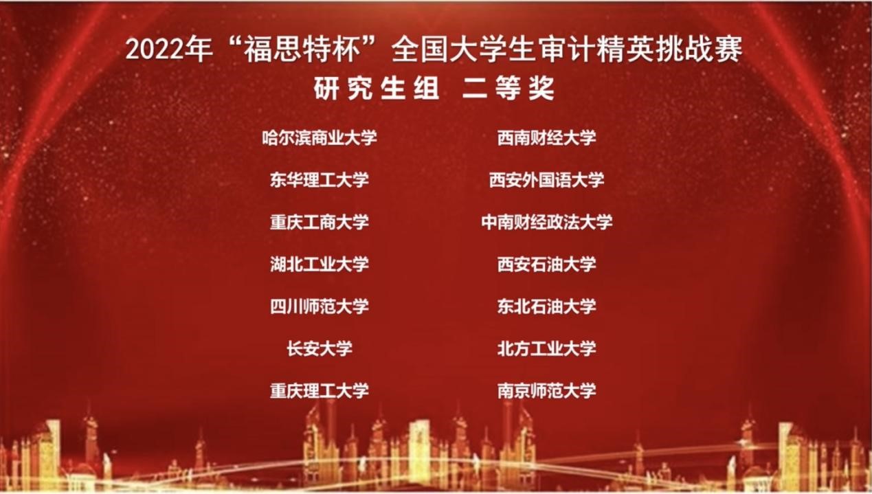 2022年11月26日,由中国审计学会审计教育分会主办、南京审计大学承办的2022年“福思特杯”全国大学生审计精英挑战赛隆重举行。本届审计精英挑战赛采用线上比赛形式,来自全国一百余所高校的390支高职、本科生、研究生队伍参赛。OK138太阳集团陈祯嫒、秦巧玲、王霖组成的本科代表队和审计专硕研究生廖雨欣、刘佳欣、李祥蓉组成的研究生代表队,从390支队伍中脱颖而出,双双斩获全国二等奖。