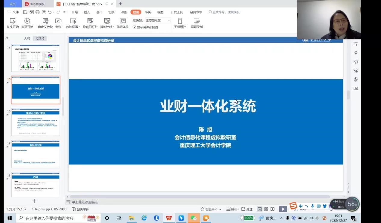 2022年12月27日下午,由教育部会计信息化课程虚拟教研室、重庆市成渝数智会计虚拟教研室、重庆市会计信息化教学名师工作室联合主办的智能会计教学工作坊(第二十九期)在钉钉APP线上直播如期举行。此次教学工作坊邀请到了重庆理工大学的陈旭、唐蕾、杨玉涵、倪红为同学们讲授《会计业务数据分析》课程。学院2022级会计专硕全体学生参加了此次教学工作坊。