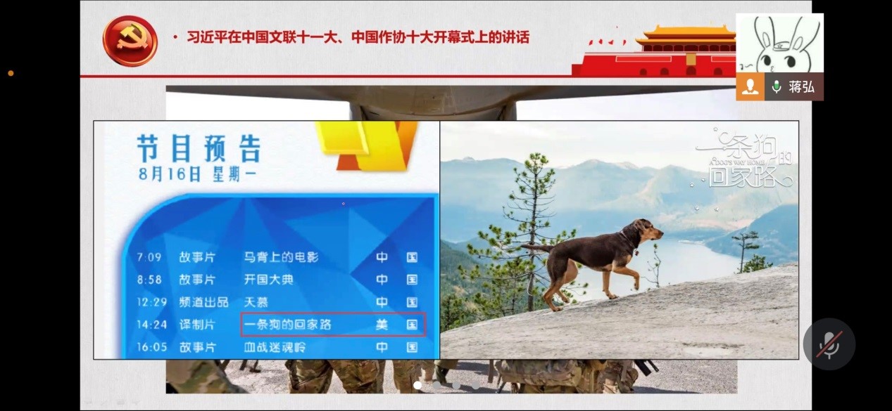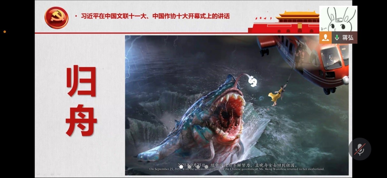 第二个事例讲的是孟晚舟女士被解救回国,CG画家乌合麒麟为此发布了一张新画,叫《归舟》。蒋弘详细解释了这幅充满细节和寓意的画作。《归舟》既吐露了对中国政府的感激,又表达了对美国政府的谴责。第三个事例讲的是被称为“六公主”的电影频道用电影这样一种文艺作品呼应当下的时代。