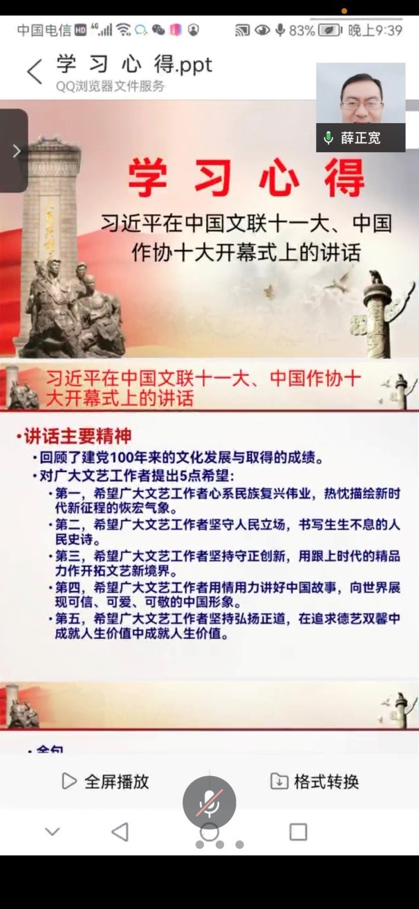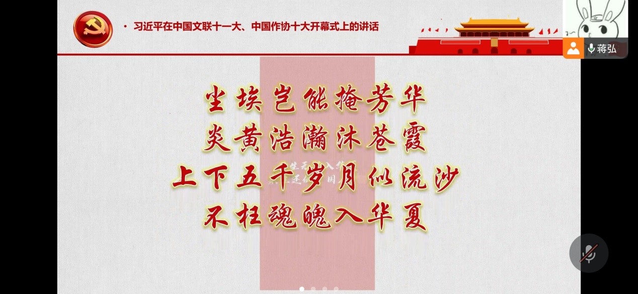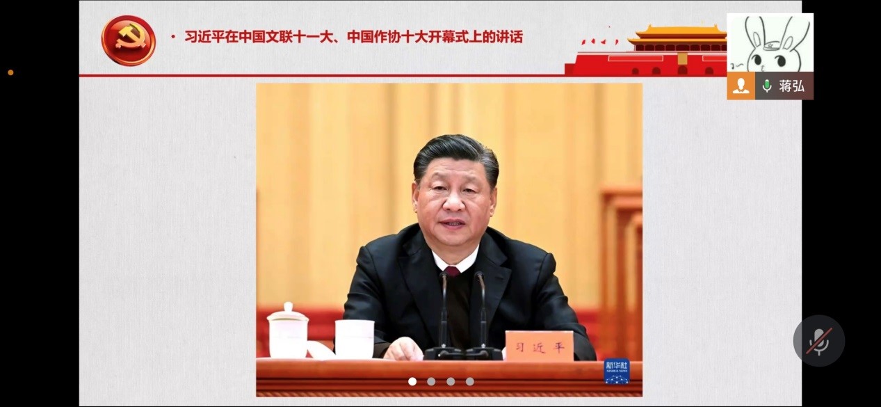 首先,蒋弘领学了“习近平在中国文联十一大、中国作协十大开幕式上的讲话”。党员同志们通过学习习总书记的讲话认识到:中国共产党是具有高度文化自觉的党,党的百年奋斗凝结着我国文化奋进的历史。中国共产党从成立之日起就把建设民族的科学的大众的中华民族新文化作为自己的使命,积极推动文化建设和文艺繁荣发展。