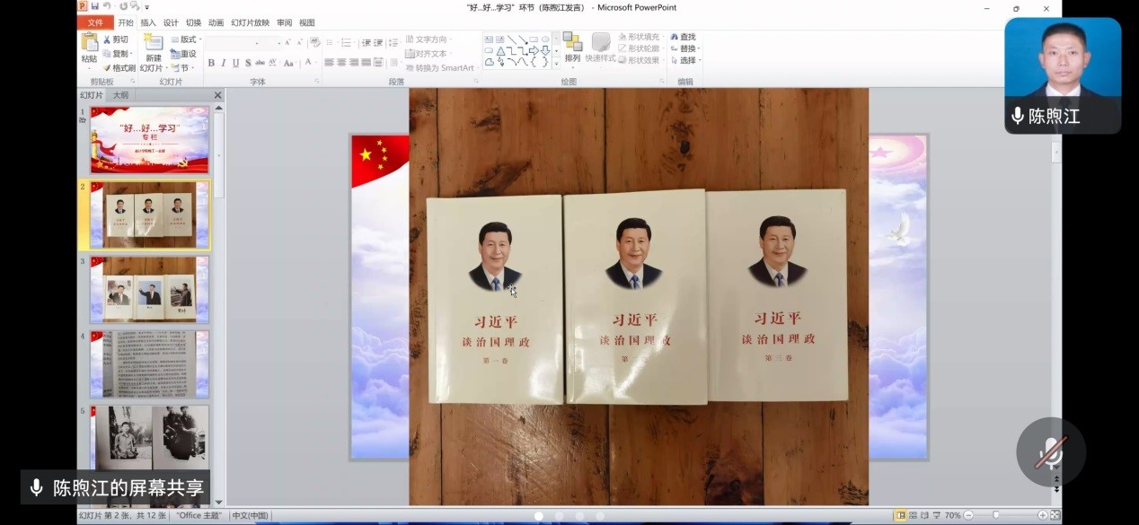 接着,陈煦江同志在“好…好…学习”环节分享了一套好书《习近平谈治国理政》。这套书收录了习总书记从2012年11月至2014年6月的79篇讲话、谈话、演讲、答问等,还收录了习总书记各个时期的工作生活照片45幅。这套书全面系统回答了新的时代条件下中国发展的重大理论和现实问题,是国际社会了解当代中国的重要窗口、寻找中国问题答案的一把钥匙。