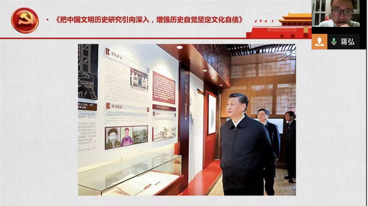 本次活动,蒋弘领学了习近平总书记重要文章《把中国文明历史研究引向深入,增强历史自觉坚定文化自信》。这是习近平总书记2022年5月27日在十九届中央政治局第三十九次集体学习时的讲话。首先,蒋弘对文章的主要内容进行了简要梳理;然后,介绍了世界遗产——良渚古城遗址。该遗址的发现为中华5000年文明提供了无可辩驳的事实依据和确凿的学术支撑;接着,蒋弘围绕主题,给大家讲述了毛泽东同志从中国历史和经典著作中汲取营养,最终成为中国历史的重要设计师的故事。