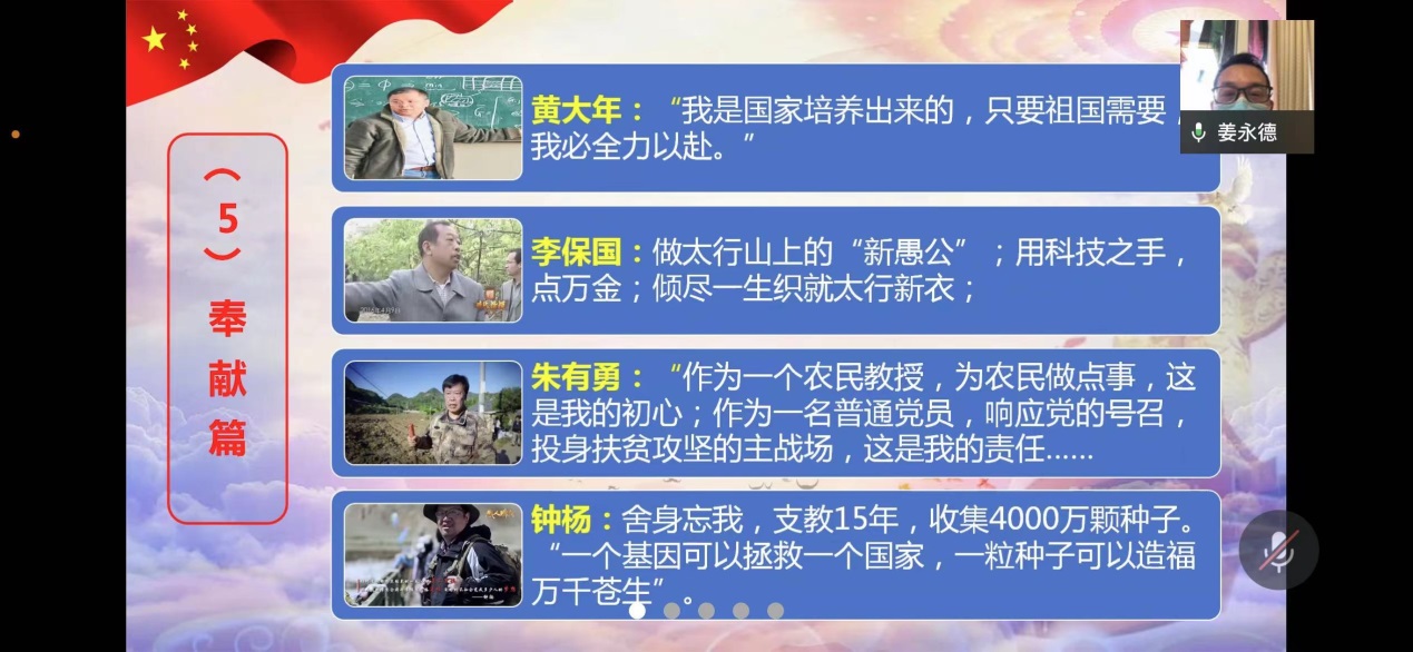 在接下来的“好…好…学习”专栏,姜永德同志给大家推荐了师德典型引领——时代楷模纪录片。这部纪录片有13集,分别讲述了黄大年、李保国、刘永坦、张桂梅等人的感人事迹。姜永德总结了这些时代楷模在“师德”方面的共同特点,那就是“忠党、爱国、敬业、无私、奉献”。最后,他认为我们作为当代高校党员教师,应该做到以下内容:加强学习,不断提高党性修养;爱国敬业,不要只汲汲于富贵;孜孜不倦,努力提升教师魅力;无私奉献,力求关爱所有学生。