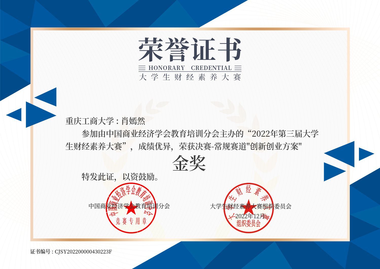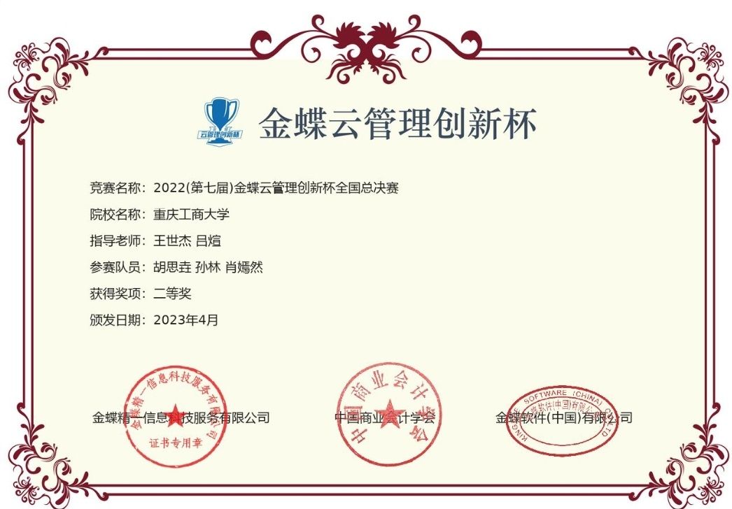入校以来,荣获奖学金、荣誉称号及各类奖项共计50余项,其中包括综合奖学金、金科星顺、萧丽玉奖学金、校友基金等,以及“重庆市三好学生”、“优秀学生”、“科技学术创新活动先进个人”等荣誉称号,获得全国大学生财经素养大赛金奖、全国大学生区块链应用技能大赛二等奖、重庆市大学生会计信息化大赛一等奖、IMA管理会计案例大赛西南赛区三等奖等,并发表省部级及以上论文2篇。已通过四六级和部分专业证书,校内外多份实践实习。