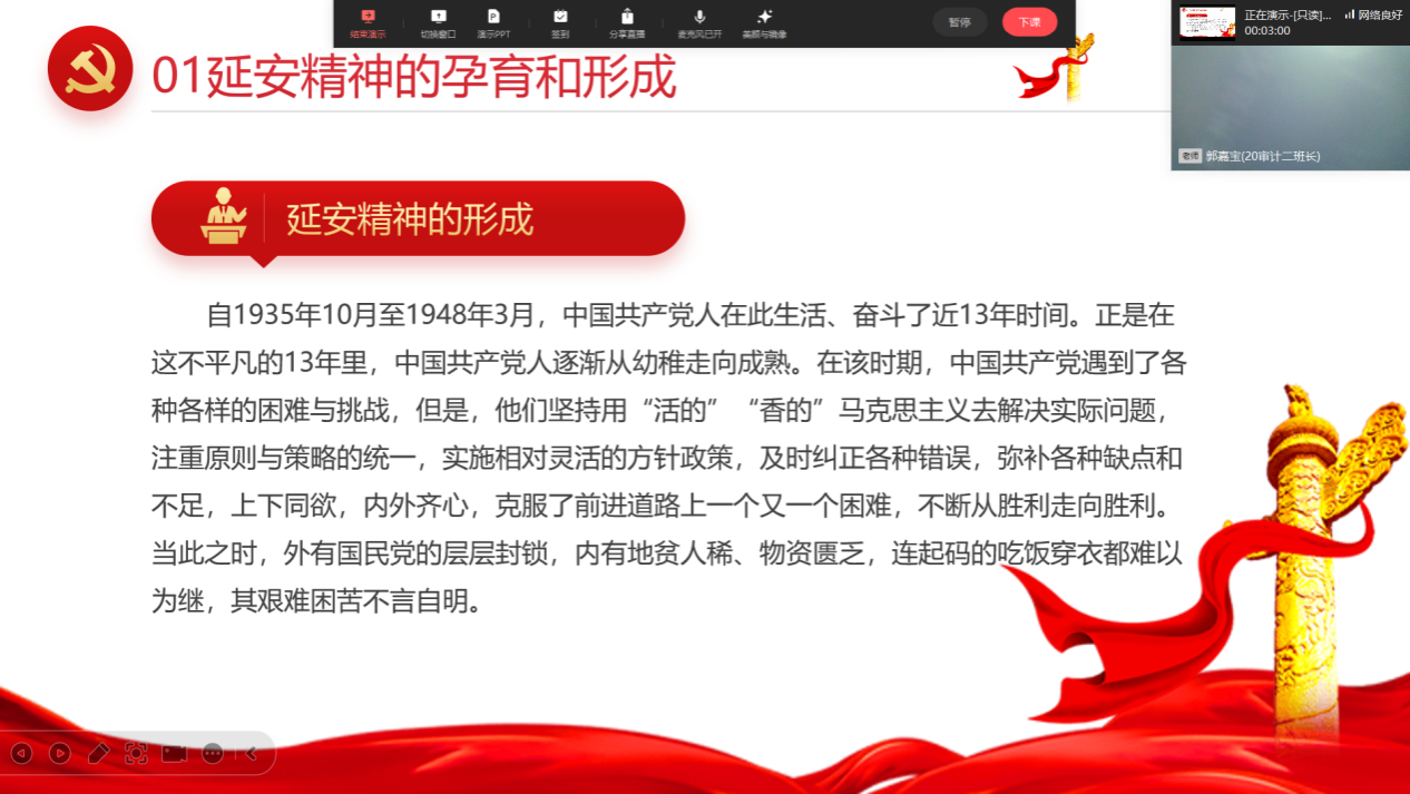 2024年5月4日,OK138太阳集团延安精神班2020级审计二班全体学生借助线上平台,成功举办了“重温峥嵘岁月,传承延安精神”五四青年节主题活动。此次活动旨在通过线上交流的形式,让同学们跨越时空的限制,共同回顾革命历史,传承和弘扬延安精神。