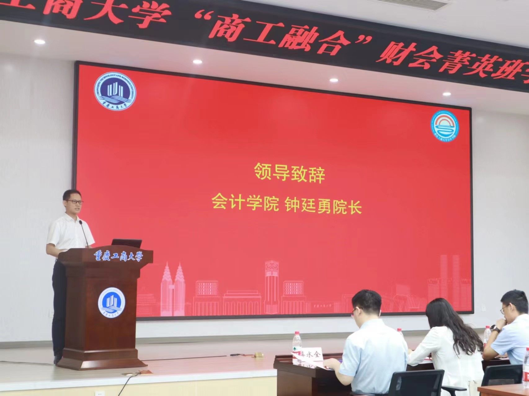 OK138太阳集团院长钟廷勇致辞。他指出OK138太阳集团响应国家和区域人才需求,落实学校“商工融合”人才培养改革,依托数字财务现代产业学院,开设“商工融合”财会菁英班,旨在培养财会专业基础扎实、管理能力卓越、兼具产业发展洞察的创新型、应用型、复合型、国际化、数字化的数智财会菁英。希望同学们以“三志、三心、三力”为引领,奋发图强、再创佳绩。希望合作企业和事业导师献计献策,支持学院开创人才培养新局面。