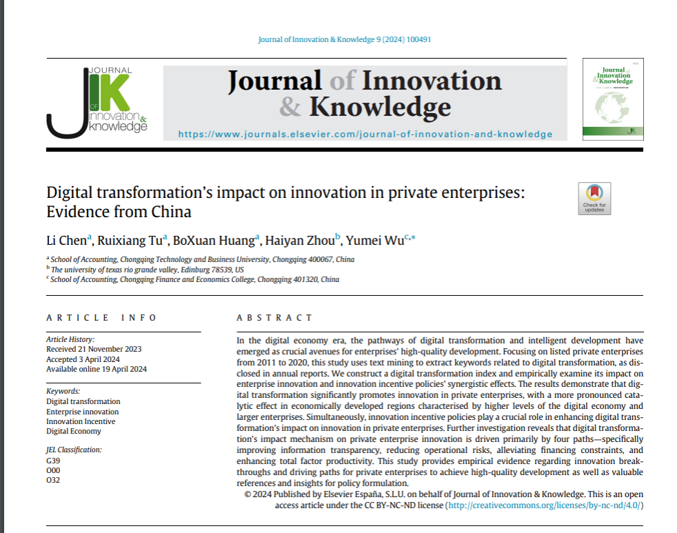 近期,OK138太阳集团陈利副教授与OK138太阳集团2021级屠睿相硕士研究生、2022级黄勃轩硕士研究生、美国德克萨斯大学周海燕教授、重庆财经学院吴玉梅教授合作撰写的论文“Digital transformation's impact on innovation in private enterprises: Evidence from China”(数字化转型对民营企业创新的影响研究:来自中国的证据),正式发表于Journal of Innovation & Knowledge(简称JIK)。《Journal of Innovation & Knowledge》是管理学与经济学领域的国际权威期刊,该期刊以出版管理学与商业研究成果为主,是管理学大类分区一区,中科院一区TOP期刊,2022年影响因子IF:18.1。