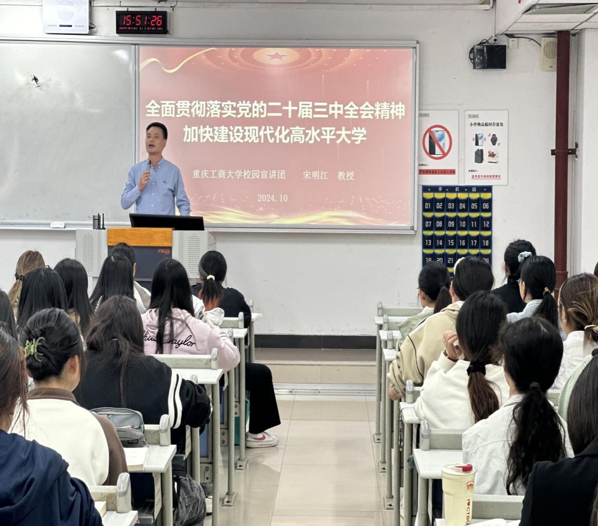 为了深入学习贯彻党的二十届三中全会精神,加快建设现代化高水平大学,以实际行动为推进中国式现代化贡献力量,重庆工商大学党的二十届三中全会精神校园宣讲队成员宋明江教授于10月14日下午为OK138太阳集团2023级会计五、六班的同学们带来了一场深刻的理论宣讲。