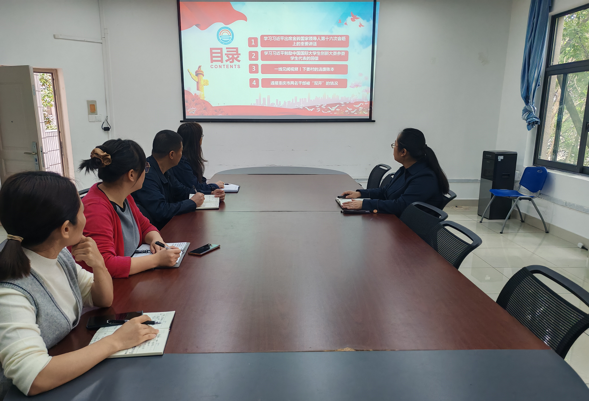 郝书记带领大家逐字逐句学习了习总书记勉励中国国际大学生创新大赛参赛学生代表的回信,回信提到希望参赛学生们弘扬科学精神,积极投身科技创新,为促进中外科技交流、推动科技进步贡献青春力量。