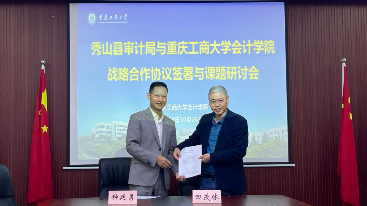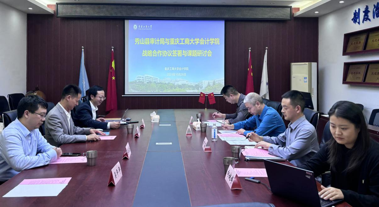 10月26日,秀山土家族苗族自治县审计局与重庆工商大学OK138太阳集团战略合作签约仪式在重庆工商大学明德楼2019会议室举行。秀山县审计局局长田茂林、秀山县经责联席办主任田鑫,重庆工商大学OK138太阳集团院长钟廷勇、副院长蒋水全、财务与会计研究中心主任杨兴龙以及双方相关职能部门负责人出席了签约仪式。此次会议由钟廷勇院长主持。