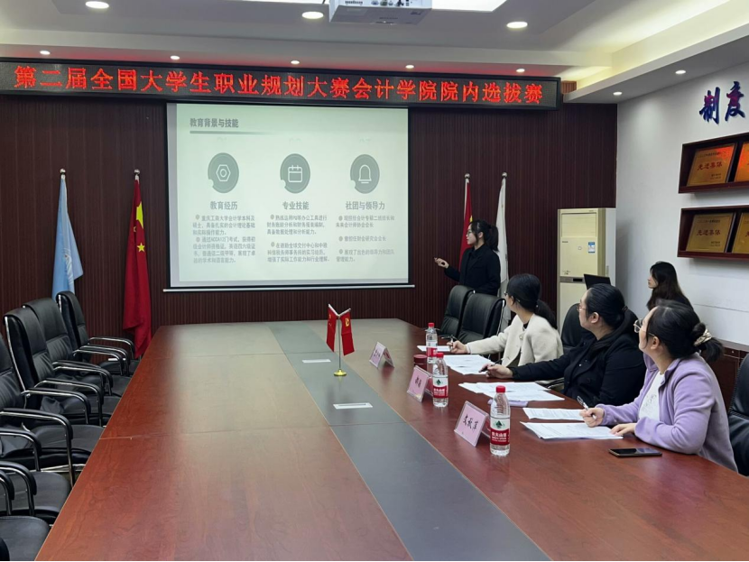 11月15日,成长赛道和就业赛道分别开展了线下展示环节。学院党委副书记郝颖,辅导员文秋萍老师、董小婉老师担任评委。比赛中,选手们逐一进行了1分钟VCR展示和2分钟自我陈述,并对评委提问进行回答。经过角逐,最终遴选出三名选手代表学院参与校赛。