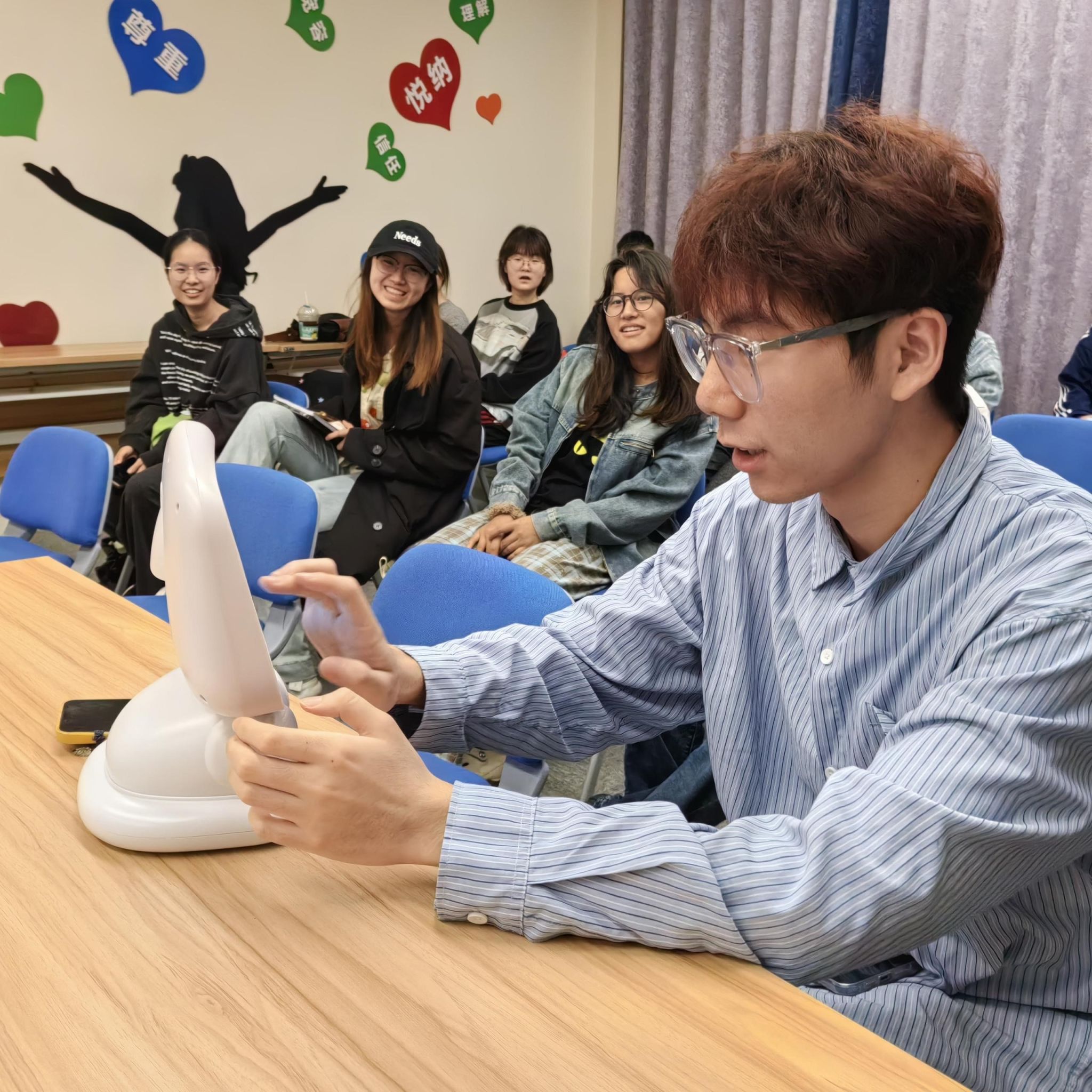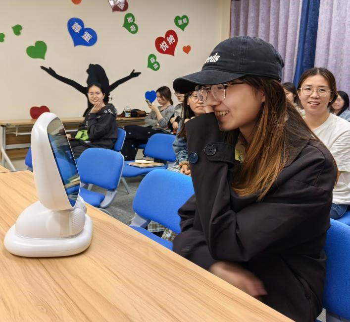活动伊始,在心理中心黄琳、姚文平老师的专业指导下,同学们一同开启了与最新投入使用的AI心理机器人“心语”的奇妙对话之旅。这款融合前沿科技的“心语”机器人,搭载了智能对话、情绪识别与压力评估等先进系统,宛如一位贴心的“心灵守护者”,能够借助自然语言交互,为学生提供精准且个性化的心理疏导建议,为学生的心理健康保驾护航。现场,同学们兴致勃勃地与“心语”展开深度对话,积极参与情绪识别测试,并针对AI生成的心理健康报告展开热烈讨论。一位参与体验的同学难掩兴奋之情,感慨道:“真没想到,机器人竟能如此敏锐地捕捉到情绪的细微波动,整个对话过程轻松愉悦又充满启发性,就像有一位专业的心理导师在身边,给予我温暖的陪伴和引导!”