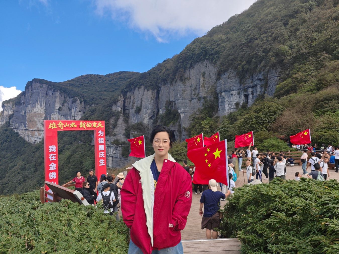 在长城与国旗的雄浑见证下,愿祖国如这山河般巍峨壮丽、繁荣昌盛。每一抹国旗红,都激荡着我们的赤诚热爱;愿祖国在时代浪潮中愈发强盛,人民安乐幸福,致敬伟大的祖国!