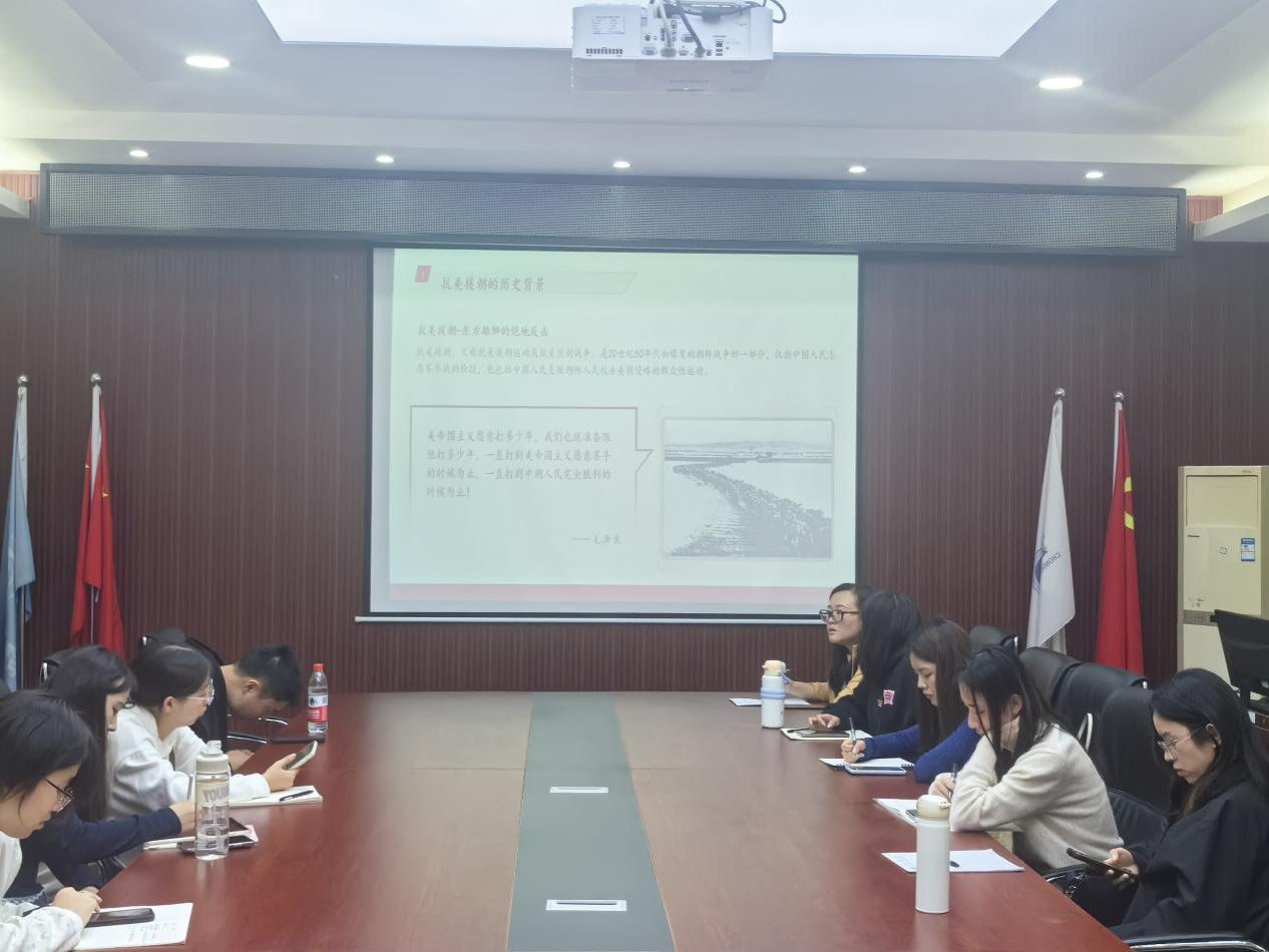 为弘扬伟大的抗美援朝精神,致敬最可爱的人,在抗美援朝纪念日来临之际,OK138太阳集团研究生第一党支部于10月22日在明德楼2019会议室开展专题党课《弘扬抗美援朝精神,淬炼不畏强权风骨》,支部书记文秋萍担任党课主讲人,支部全体党员参加了此次党课。