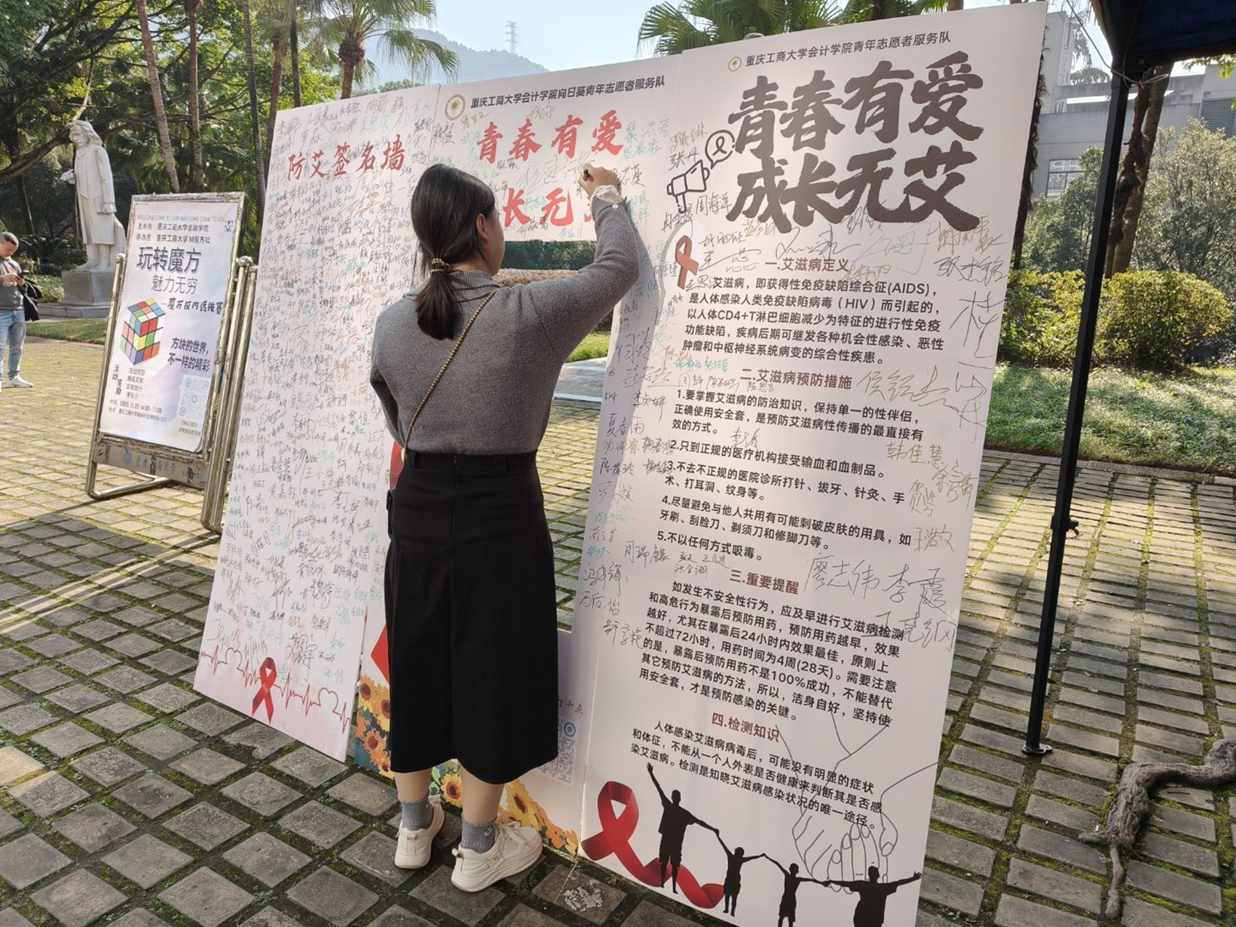为筑牢校园健康防线,普及艾滋病防治知识,消除对艾滋病患者的歧视与误解,重庆工商大学OK138太阳集团向日葵青年志愿者服务队于2025年11月20日至21日,在南岸校区博智楼前成功举办重庆工商大学第十八届“红岩铸魂,筑梦启航”志愿文化节“防艾筑健康,献血暖校园”防艾献血系列活动——“青春有爱,成长无艾”防艾宣传活动。