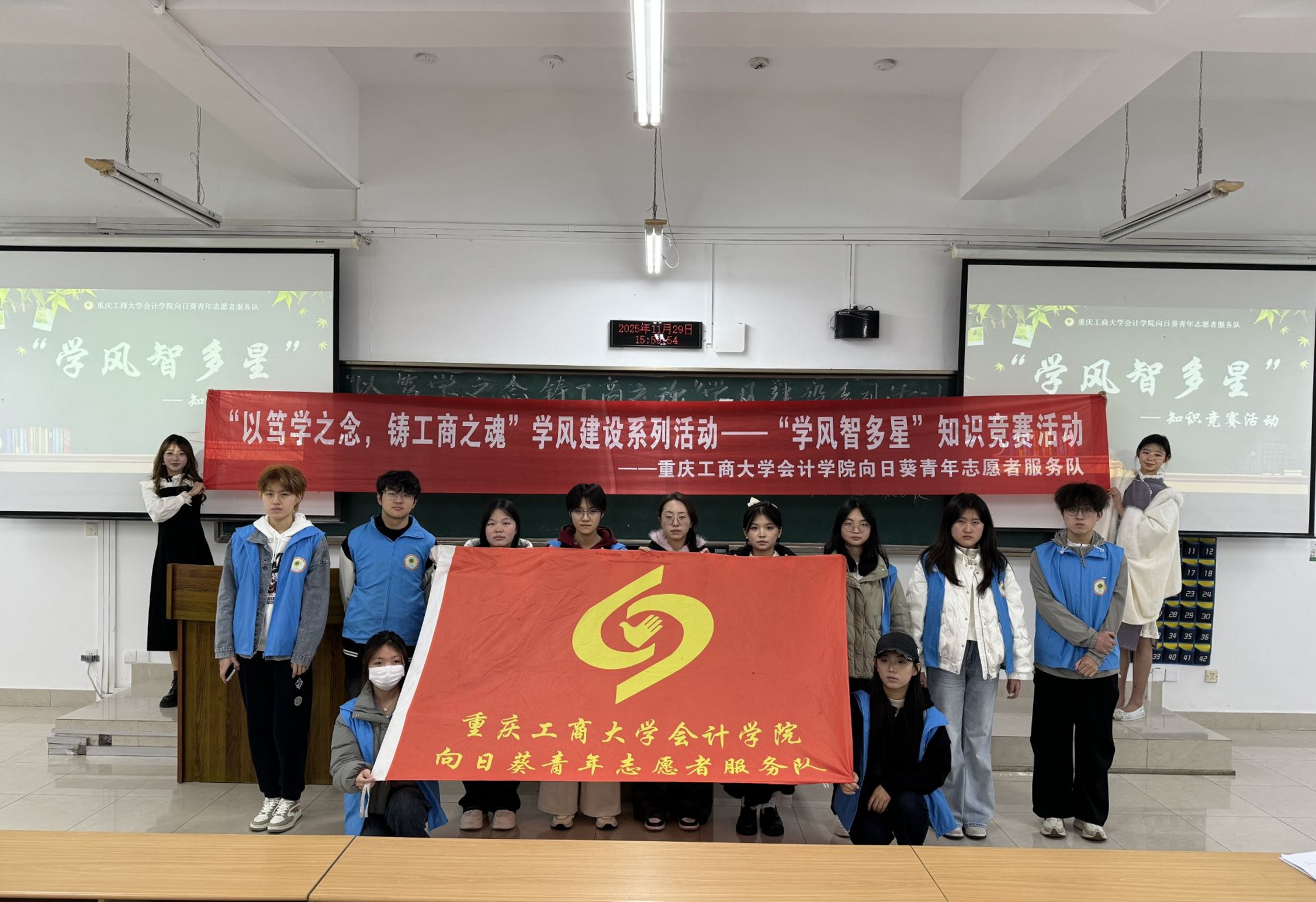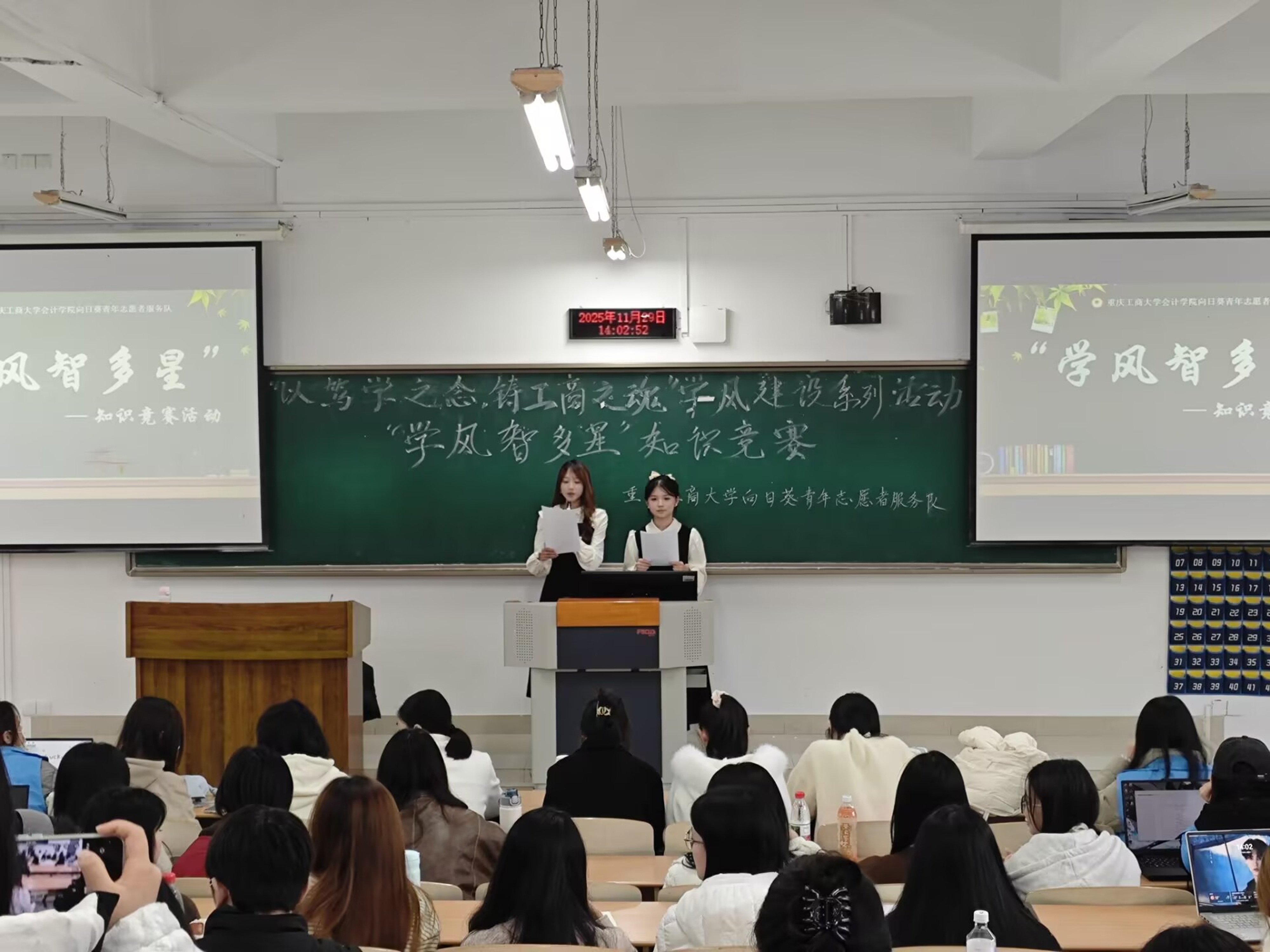 学风是校园精神文化的核心底色,关乎学生成长与学校育人实效。为破解部分学生学习目标模糊、时间管理松散等问题,2025年11月29日14:00,重庆工商大学OK138太阳集团向日葵青年志愿者服务队在南岸校区博智楼,成功举办“以笃学之念,铸工商之魂”学风建设系列活动之“学风智多星”知识竞赛活动。全校25支参赛队伍、75名学子集结赛场,以专业比拼点燃学习热情,用团队协作展现青春风采,为校园学风建设注入鲜活力量。