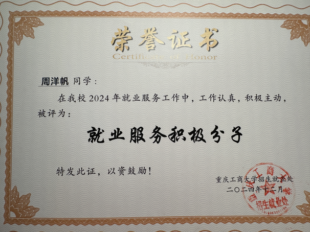 在学生工作中,周洋帆履职尽责、积极作为,曾任职学校新闻中心干事,现担任校大学生职业发展与就业服务委员会部长,在岗位上锤炼组织协调与沟通能力,为校园工作推进贡献力量。同时,她心怀热忱、践行公益,积极投身各类志愿活动,累计志愿时长超200小时,以实际行动传递温暖,彰显青年学子的社会责任感,在实践中实现个人价值与社会价值的双向契合。