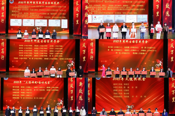 颁奖环节,重庆工商大学党政办公室主任蒋年韬为2025年教师教育教学国家级及以上获奖老师颁奖;重庆工商大学教务处副处长韦晓兰为2025年教师教育教学省部级及以上获奖老师颁奖;重庆工商大学党委学生工作部部长申卫东为 2025 年学生国家奖学金本科获奖学生颁奖;党委研究生工作部副部长郑强为2025年学生国家奖学金研究生获奖学生颁奖;天健会计师事务所重庆分所人力资源总监许静为天健奖教金获得者颁奖;重庆大信谛威集团总经理刘先利,重庆工商大学团委副书记王微为“大信谛威•会计之星”获奖者颁奖。