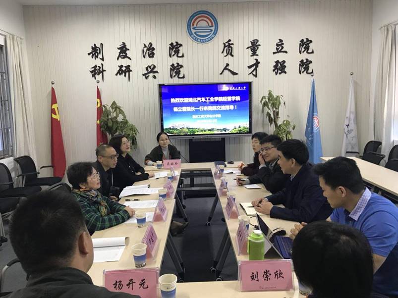 2018年3月15日上午,湖北汽车工业学院经济管理学院杨立君院长、周明智主任、程曾平副主任、刘崇欣教授和於流芳博士来学院进行调研交流,罗惠玉书记、尹建平副书记、黄辉副院长、杜迎新主任、吴娅玲博士、杨开元博士、韩超博士和李传彪老师参加了交流会。