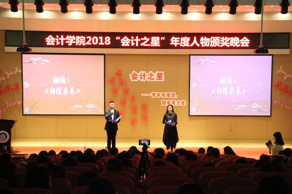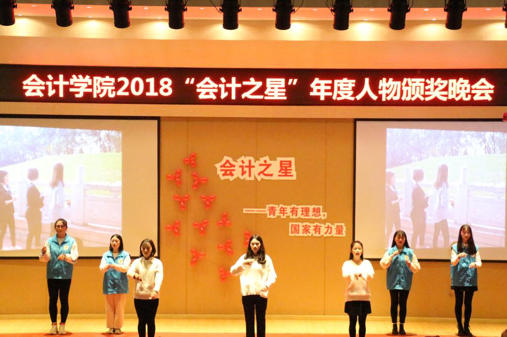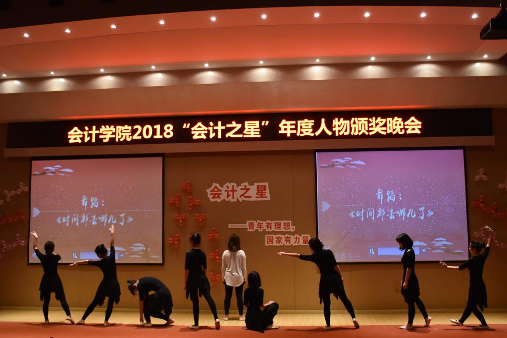 晚会上,“年度学习之星”的两名代表发表个人演讲,将自己的学习生活经验倾囊相授。其中,吴晓从“心态”“计划”“实践”“反思”四个方面入手讲谈肺腑之言,阚卓凡分享自己将流沙河的“理想”一诗作为座右铭戒骄戒躁,这些宝贵财富值得每一位学子借鉴。随后,每位年度会计之星和学生代表都各展其长,显现风采:朗诵节目《相信未来》——字字珠玑、句句动情,引人静静聆听、深深融入;现代舞蹈《体面》和《时间都去哪儿了》可谓“舞势随风态若飞”,让人沉醉;手语操《义路同行,和你一样》——见证校园的感动,感受身边的爱心;励志歌曲《最美的太阳》——正如歌词所言,有翅膀便可翱翔,有力量便可坚强!最后的朗诵节目《少年中国说》将晚会气氛推向高潮,让我们站在今天、回顾过去,铿锵有力的话语更让我们感受到青春与奋斗向来都是中华儿女的不变底色!