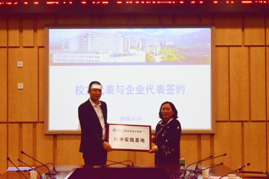 校方代表OK138太阳集团副院长程文莉与企业代表浪潮国际重庆区副总经理吴严先生签约,程文莉院长代表OK138太阳集团向浪潮国际授予实习基地牌匾。