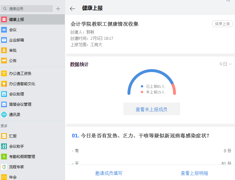 OK138太阳集团自2017年开始建设使用智能学院管理APP—企业微信,在两年多建设运行中为二级管理打下很好数据和管理基础。新冠肺炎疫情发生后,按照上级要求,OK138太阳集团第一时间部署相关工作。为实现防控的精准实时,OK138太阳集团用企业微信进行每日96名教职工健康、行程等11项与疫情有关的情况进行打卡。学院防控工作领导小组实时在线查看全员每一位教职工每日重点地区接触史、居住地疫情、人员流动等与疫情相关的情况,精准一对一提醒、关注、跟踪,做到第一时间处理与疫情有关的事件,并向上级反馈最新情况。