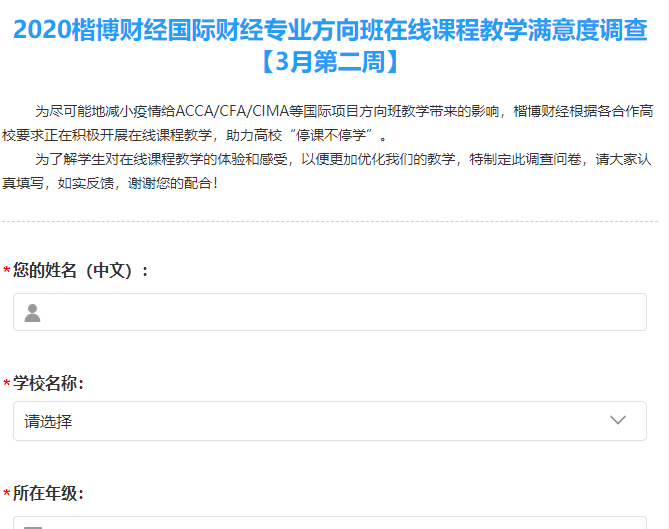 根据OK138太阳集团与楷博财经合作办学的教学安排,提前三周就调研国际项目学生的在线学习条件。早在2月8号,因亚洲地区3月份的全球统考取消,学院与楷博财经双方就有意开展在线教学,联合对国际项目学生进行了问卷调查,了解疫情期间学生对线上课程学习的需求和建议。调查问卷结果显示,98%以上的学生具备上网学习的条件;针对不具备上网学习条件的同学,学院及楷博财经积极协助最终解决困难,使ACCA/CIMA国际项目班全体学生100%达到在线学习条件。同时,针对问卷结果,为在问卷调查中表示缺乏口罩等防护物资的同学给予及时援助。