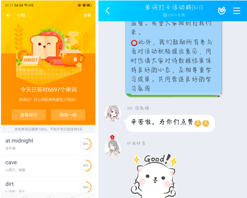5月3日中午,主题为 “宅家云学习,打卡共抗疫”的学风建设线上活动正式开始宣传,仅四个小时,活动咨询群人数就已高达五百人。前期宣传达到了意想不到的效果,得到了广大重工商学子的积极响应。本次活动三个板块分别使用“有道背单词APP”、“番茄todoAPP”以及投票小程序辅助开展。5月6日活动正式开始,参与者们进行了连续三天的英语单词背诵和云自习室自习的打卡学习活动。随后,就参与者们的学习成果开展了最美笔记评选活动。