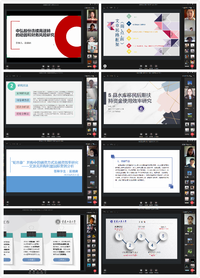 首先,宣布答辩规则。由答辩组长报告答辩委员会组成、答辩人情况、宣读答辩规则并宣布答辩开始;随后,学生陈述论文。同学们答辩准备认真充分,答辩PPT制作精美用心,在答辩过程中论述清晰、流畅。同学们的论文紧跟会计研究前沿热点,包括自然资产离任审计、财务共享、股权质押、环境审计、高送转、业绩承诺、内部控制、供应链金融、并购管理等方面;第三,答辩委员提问。答辩专家秉承严谨细致、认真负责的学术态度,认真倾听同时做好记录,在答辩人报告完毕后提出问题,并从论文的规范性、逻辑性、文献综述、论文边际贡献、案例研究方法、论文严谨性和创新性提出修改意见。答辩委员们所提出的问题发人深省,修改意见对于同学们的论文来说均是点睛之笔;第四,专家评分。所有同学陈述及回答完毕后退出会议室,答辩委员会委员对答辩过程与结果进行评议并进行线上评分;最后,答辩总结。各答辩人和观摩者重新进入会议室,由答辩组长对答辩情况进行总结并宣布答辩结束。在2天中,整场远程视频答辩在紧张严肃的氛围下圆满结束。