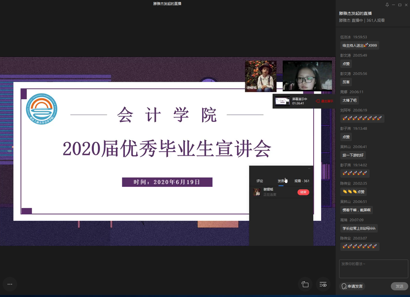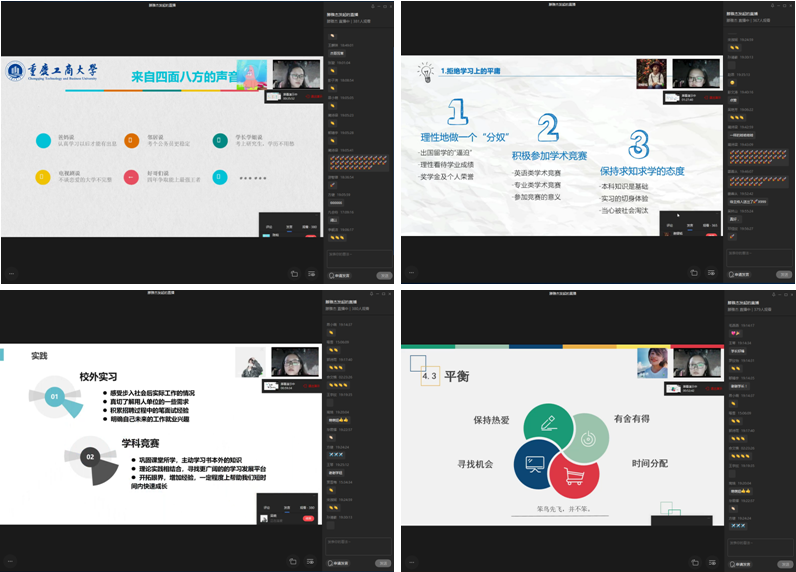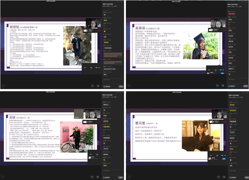 为充分发挥优秀毕业生的示范引领作用,在全院范围内营造学习典型争当先进的良好氛围,引导低年级学生做好大学学业/职业生涯规划,6月19日19:00,由OK138太阳集团分团委主办的OK138太阳集团2020届优秀毕业生宣讲会在企业微信通过直播方式进行。此次宣讲会邀请到彭文涛老师和来自2016级ACCA吴晓等五名优秀毕业生,学院2018级、2019级近400名同学参加了宣讲会。