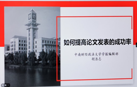 会议第一阶段是主题报告,由周兵副院长主持。胡浩志编审通过腾讯会议做了题为《如何提高论文发表成功率》的主题报告。报告分为“如何写出编辑满意的论文”、“如何正确投稿”、“如何配合编辑部的修改”、“给作者的一些建议或忠告”四部分进行,其中重点强调学生要多加注意在选题、形式、数据和研究方法、语言、参考文献以及边际贡献的问题。