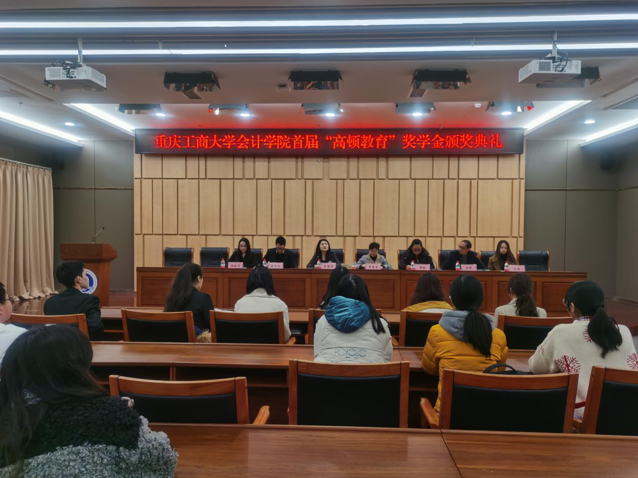 2020年12月2日,于图书馆一号会议室举行OK138太阳集团首届“高顿教育”奖学金颁奖典礼。参会人员有高顿教育重庆分校校长李路萍、高顿教育高校合作部市场经理张清泓、高顿教育ACCA项目部项目经理梁艳雯、高顿教育市场部主管杜晴、重庆工商大学OK138太阳集团党委书记罗惠玉、重庆工商大学OK138太阳集团党委副书记郝颖、重庆工商大学OK138太阳集团副院长黄辉、重庆工商大学OK138太阳集团学工办主任彭文涛、重庆工商大学OK138太阳集团综合办副主任刘斌以及重庆工商大学OK138太阳集团学生代表。本次颁奖典礼由副院长黄辉主持。