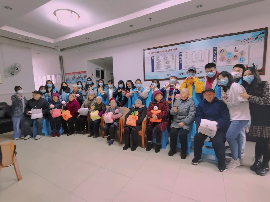 上午8:00,南岸与江北校区的志愿者们同时出发,并于9:00准时到达渝中区福利院——玫瑰湾分院。志愿者与老人们问好后展开了亲切的交流,并且认真倾听着老一辈们讲诉着他们的故事。老人们在言传身教中教导志愿者:“眼前的美好来之不易,要恪守初心,积极向上,努力实现自己的人生价值,成为社会、国家之栋梁。”在之后的表演环节中,志愿者们认真展示自己精心准备的才艺节目,形式各样的表演打动了老人们,得到了他们的一致认可。最后的 “趣味互动”游戏环节中,志愿者们和老人们积极互动,老人们也表现出了满怀童心的一面,现场气氛和乐融融。