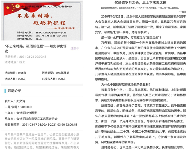 3月15日,征文比赛如期开展,同学们参与热情高涨。截止22日,共收到112份征稿。参赛作品首先由会计义协成员组成的评审团进行初评,再由学院老师复评,最终遴选出12份优秀作品。本次活动采用线上征集征文的形式引导在校学生学习四史,模式新颖,能够激发参与者的兴趣。值得一提的是,部分作品从专业角度进行分析,更加深刻地描写了在党的领导下人民社会生活发生的巨大变化。从无数历史大事件和人物事迹中,我们明白了“是历史和人民选择了中国共产党,只有中国共产党才能救中国,只有中国共产党才能发展中国”。