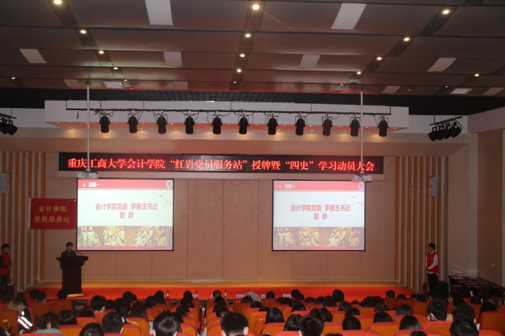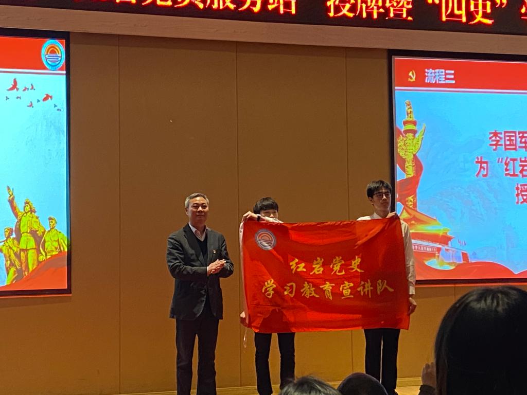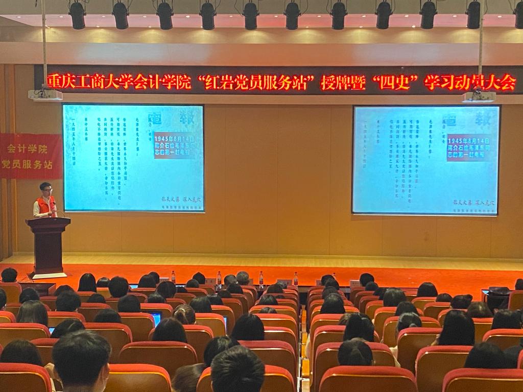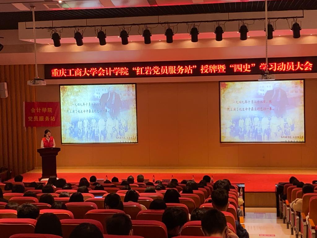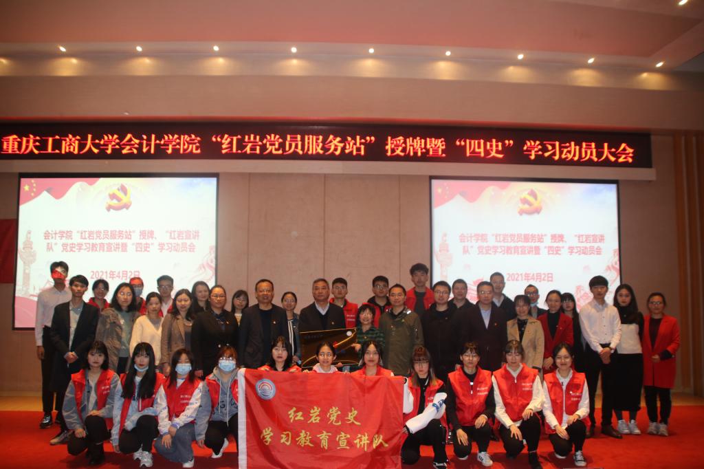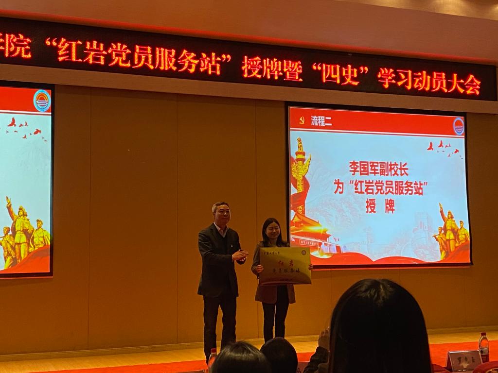 4月2日中午,OK138太阳集团“红岩党员服务站”授牌、“红岩宣讲队”党史学习教育宣讲暨“四史”学习动员会在南岸主校区田家炳书院209报告厅隆重举行。重庆工商大学副校长李国军,OK138太阳集团党委书记罗惠玉、专职组织员石世明,学生处公寓管理科科长冯湛,OK138太阳集团党员服务站指导老师王婷以及OK138太阳集团各党支部书记,学生党员代表、入党积极分子代表共200余名师生参加了此次活动。活动由OK138太阳集团党委副书记郝颖主持。