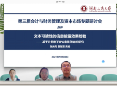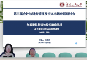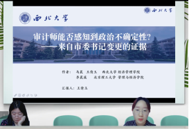 在上半场的学术研讨活动中,中央财经大学博士研究生薛慧丽、新加坡南洋理工大学博士研究生罗思佳、西南政法大学的陈正威和重庆工商大学的王铭瑞随后也相继作了“文本可读性的信息披露效果检验——基于注册制下IPO审核问询的研究”“The dark side of analyst coverage: The case of corporate leverage adjustment”、“资本市场开放、企业社会责任与审计费用”、“ESG 表现对企业价值的影响及作用机制”的学术报告。湖南工商大学朱晓燕、西安交通大学博士研究生朱美乐、西北大学王倩玉和重庆理工大学冉铸对上述学术报告予以了点评。