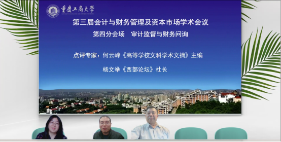 10月30日下午,第三届会计与财务管理及资本市场学术会议第四分会场——审计监督与财务问询在线上成功举行。来自西北大学、新加坡南洋理工大学、西安交通大学、中央财经大学、西南政法大学、湖南工商大学、重庆理工大学、重庆工商大学等高校的学者们相继围绕分论坛主题作了学术报告。《高等学校文科学术文摘》何云峰主编、《西部论坛》杨文举社长应邀担任了分会场的点评专家。四川外国语大学代彬教授、西南政法大学陈丽蓉教授分别主持了分会场的上半场和下半场的学术研讨活动。