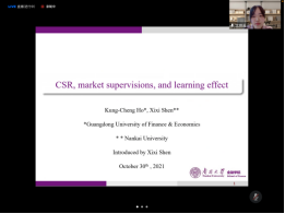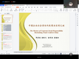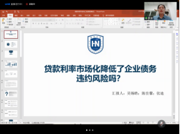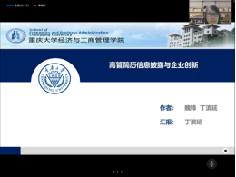 在上半场的学术研讨活动中,江西财经大学博士研究生章君瑶、南开大学沈锡茜、重庆大学博士研究生丁滨延和海南大学的张迪相继作了“‘金色锦旗’还是‘灰色面纱’——中国企业社会责任约束商业信用之谜”“CSR、market supervisions and learning effect”、“高管简历信息披露与企业创新”、“贷款利率市场化降低了企业债务违约风险吗?”的学术报告。重庆大学博士研究生丁滨延、北京科技大学教师赵天娇、中国人民大学副研究员强皓凡、重庆工商大学黄亦博对上述学术报告予以了点评。随后,由《财经问题研究》编辑部主任徐雅雯从编辑的角度出发,总结性地点评了上半场的学术报告,针对性地提出了意见和建议。