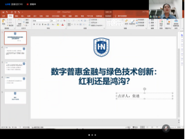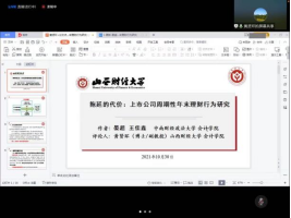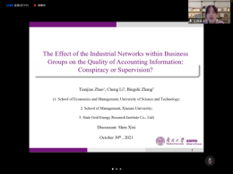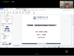 在下半场的学术研讨活动中,山西财经大学刘梦童、北京科技大学教师赵天娇、重庆工商大学龚钰捷和中南财经政法大学王佳鑫分别作了“‘子强母弱’型集团能够实现盈余可持续性吗?”、“The Effect of the Industrial Networks within Business Groups on the Quality of Accounting Information: Conspiracy or Supervision?”、“数字普惠金融与绿色技术创新:红利还是鸿沟?”、“拖延的代价:上市公司周期性年末理财行为研究”的学术报告。中南财经政法大学王佳鑫、南开大学沈锡茜、海南大学张迪、山西财经大学黄贤环对上述学术报告予以了点评。最终,由《财经问题研究》编辑部主任徐雅雯对下半场报告进行总结性点评。