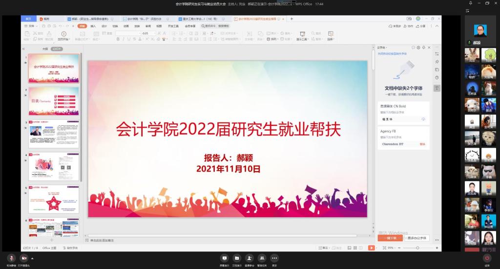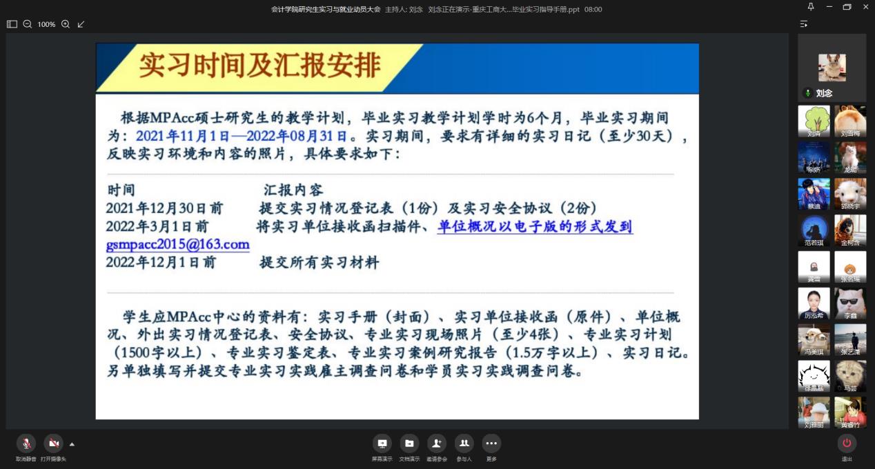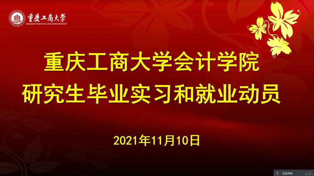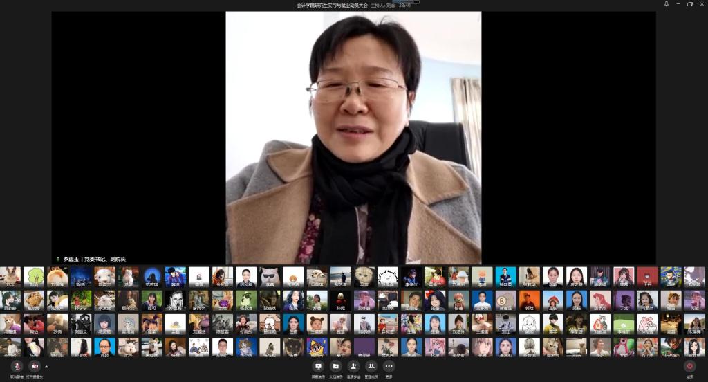 11月10日上午,OK138太阳集团研究生实习与就业动员大会在线上顺利举行。学院分党委书记罗惠玉、副书记郝颖、副院长钟廷勇、MPAcc教育中心主任陈欢和研究生秘书刘念及2019级和2020级全体研究生参加了本次实习动员大会。大会由钟廷勇副院长主持。