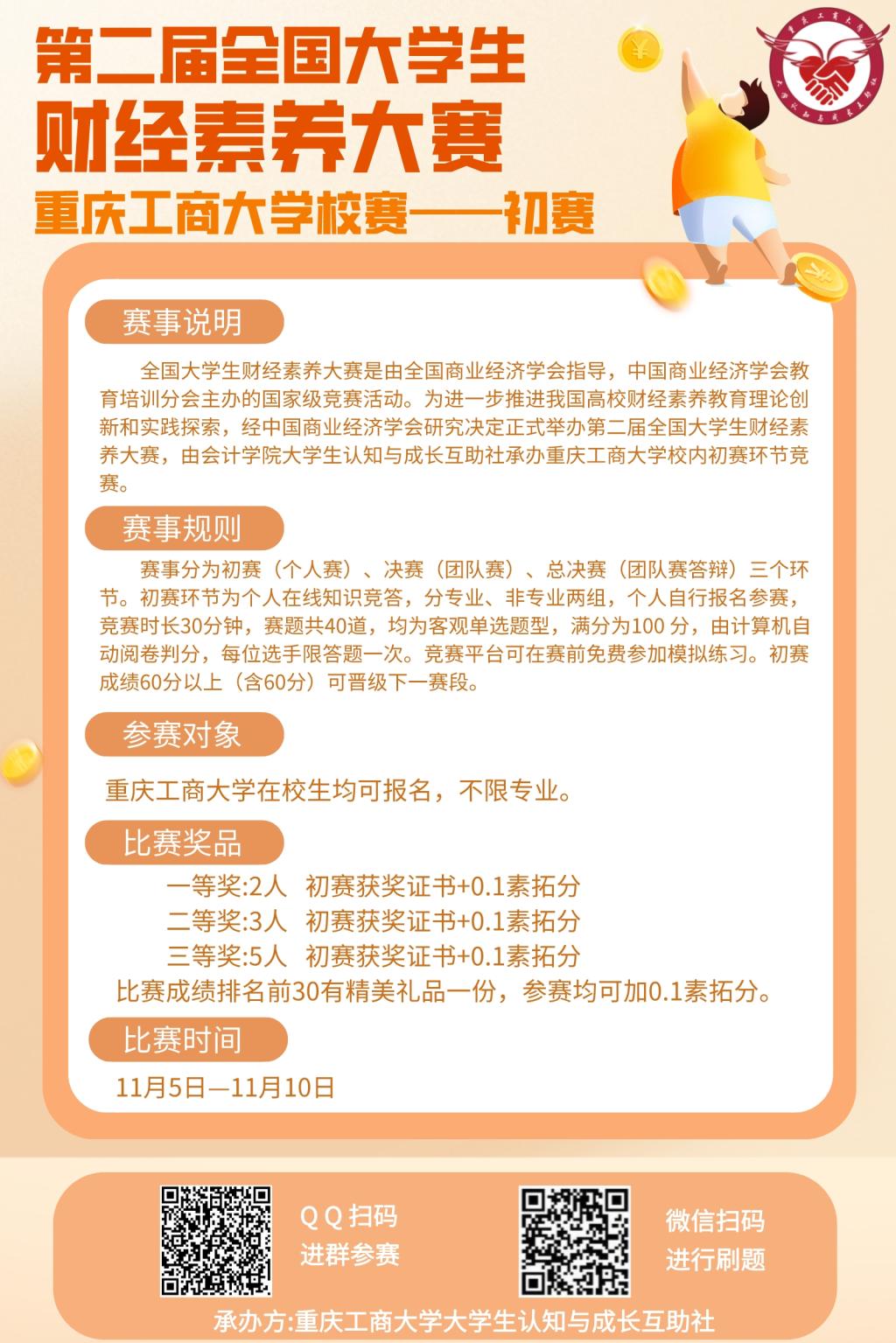 为进一步推进我校财经素养教育理论创新和实践探索,培育学生财经素养正确认知、处理与管理财经事务的能力,由重庆工商大学OK138太阳集团主办,大学生认知与成长互助社、财会研究会携手承办的第二届全国大学生财经素养大赛初赛于本月20日圆满落幕。