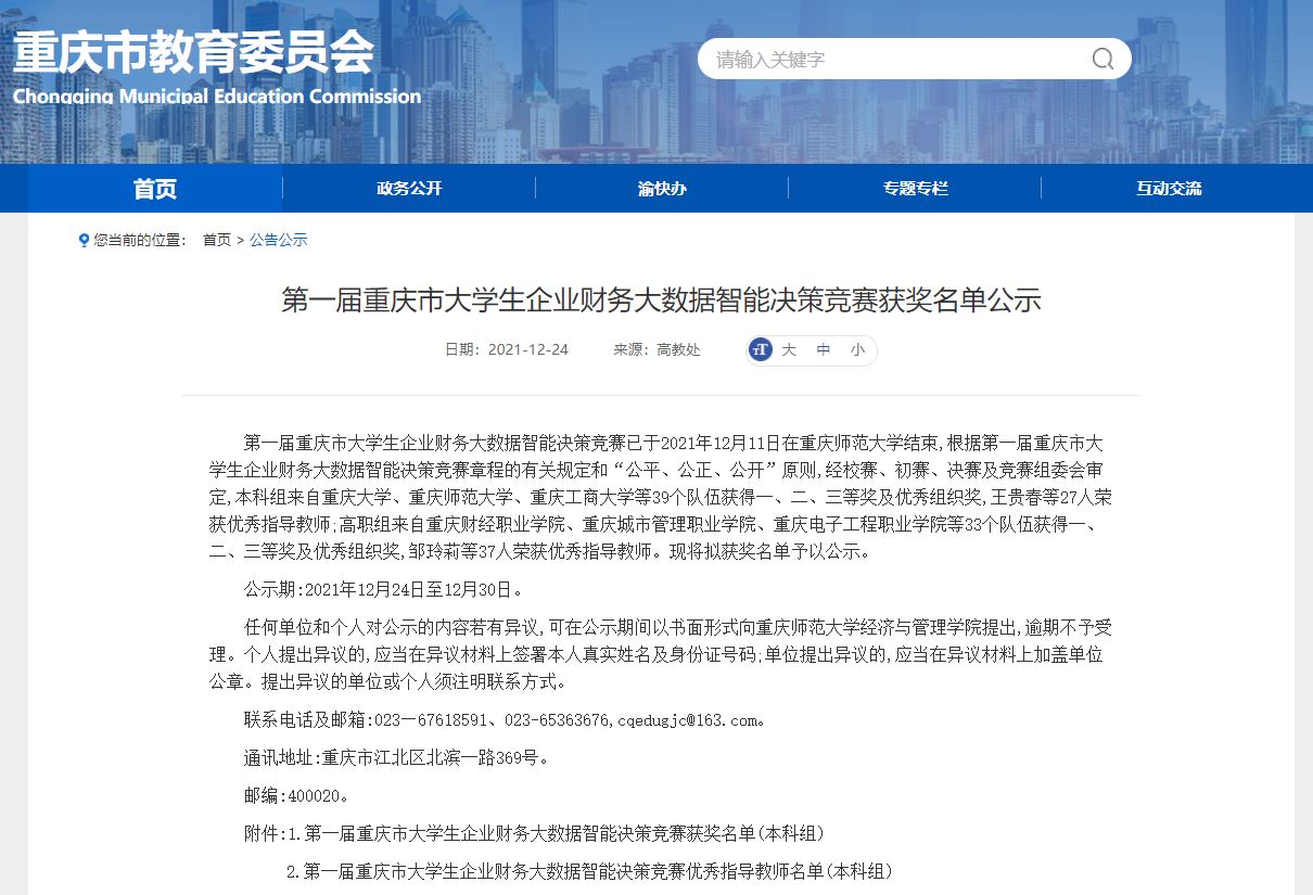为贯彻落实《教育部关于加快建设高水平本科教育全面提高人才培养能力的意见》,切实提高大学生创新精神和实践能力。由重庆市教育委员会主办的 “重庆市大学生企业财务大数据智能决策竞赛”决赛于2021年12月11日在重庆师范大学落下帷幕。