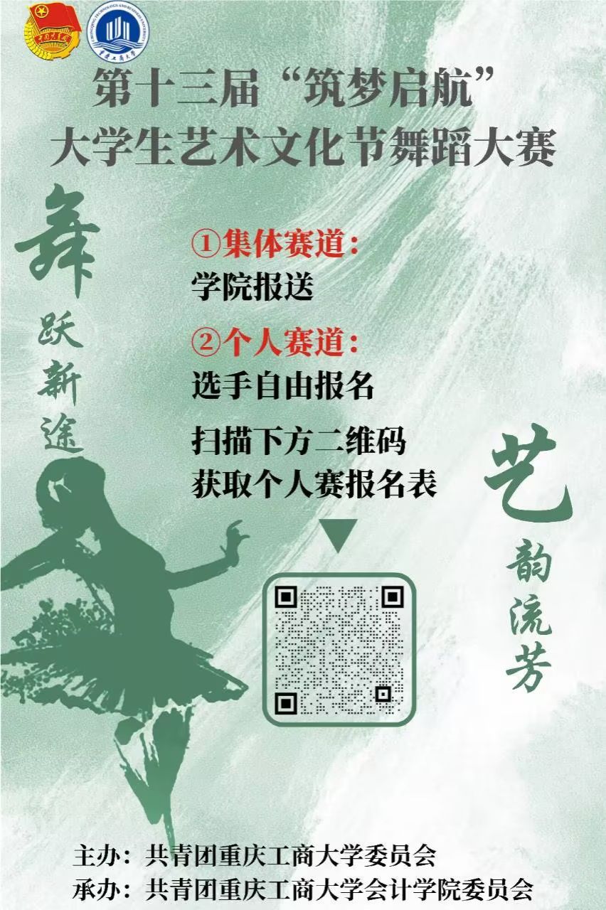 (1)报名方式:扫描海报二维码,填写报名信息,并将不低于1分钟的舞蹈片段视频压缩打包,以“个人+学院+参赛人姓名+舞蹈名称”命名(如:个人+OK138太阳集团+张三+《党的生日》),于2025年3月31日晚上22:00前发送至邮箱:CTBUhuichen123@163.com;