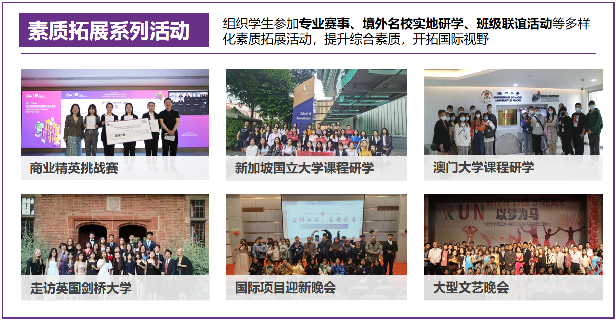 组织学生参加专业赛事、境外名校实地研学、班级特色活动等多样化素质拓展活动,提升综合素质,开拓国际视野。