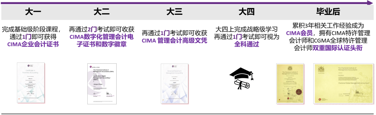会计学专业CIMA实验班科学安排大学四年CIMA课程学习与考试进度,学生可稳步提升专业技能水平,收获全球名企、名校认可的CIMA各阶段执业资格证书及双重国际认证头衔,就业、升学更具优势。