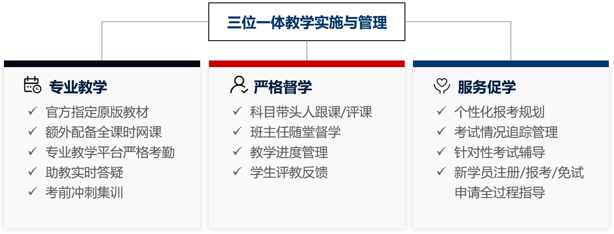 CIMA授课老师均为具备名校学历背景、丰富名企从业经验和执教经验的CIMA持证人,并额外配备专职班主任与助教老师,学习全过程辅导,及时扫除知识盲点;免费额外配备全课时网络课程、重难点知识串讲、习题库等完善的学习资料,帮助学生高效完成各阶段学习任务,CIMA考试通过效率更高。