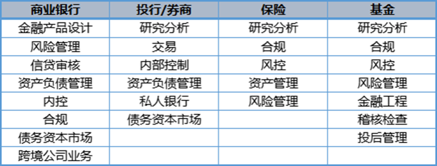 FRM项目班学员在本科或研究生毕业后,可优先考虑对FRM认可的相关单位——涉及银行(外资银行/内资银行),投资/基金(公募基金/私募基金/风险投资),互联网金融(互联网融资/互联网支付),投行/券商,保险、咨询,会计师事务所/律师事务所等行业