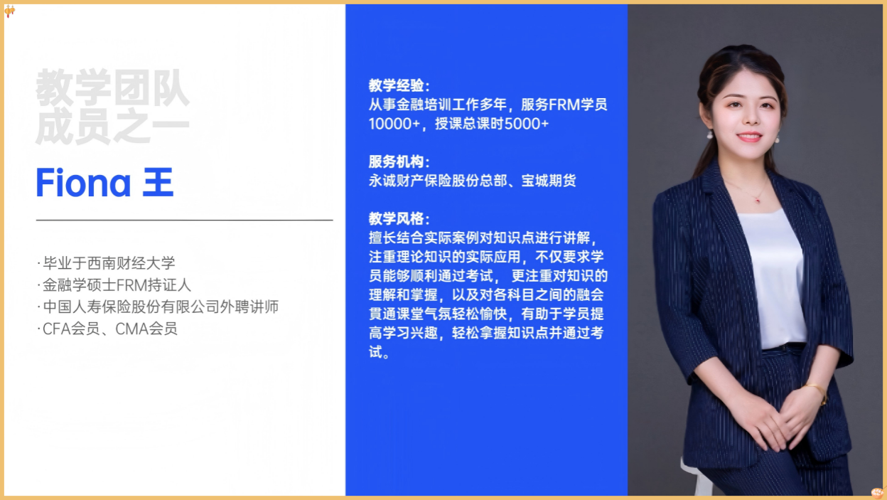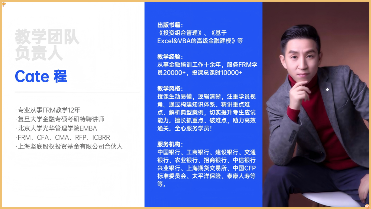 3.FRM课程由金融领域具有丰富实务经验的FRM持证精英老师授课。