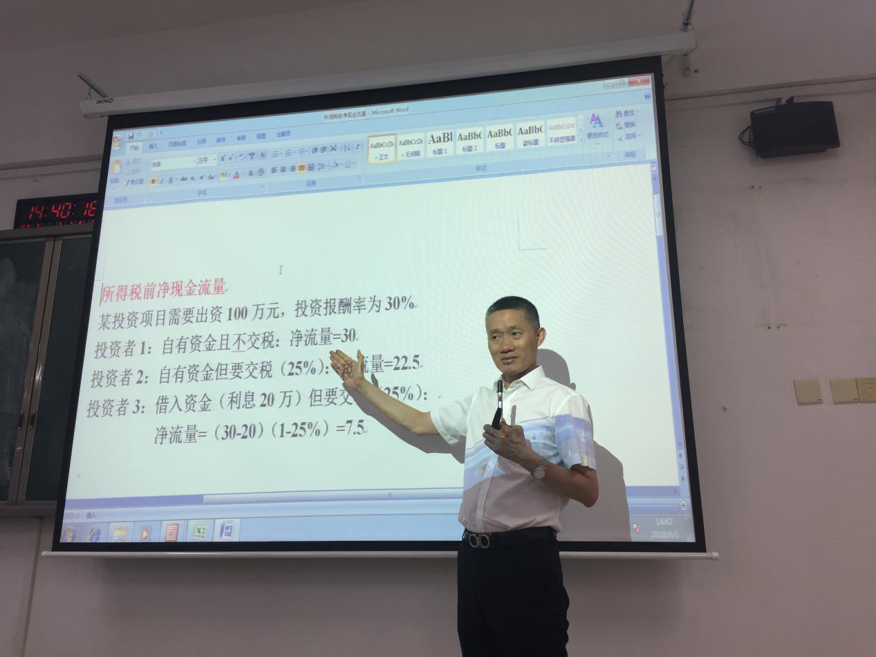讲座伊始,杨老师用了一个妙趣横生的比喻解释了本次讲座的主题:一个人去相亲,回来以后会得出两种结论,一种是这个人不行,另一种是这个人不适合我。“不行”即是对投资项目的评价,“不适合”即是对自身的效益分析。同学们会心一笑。在轻松的氛围中,杨老师开始讲解本次讲座的主要内容。首先,杨老师进行了项目投资现金流量分析,依次介绍了现金流出量与流入量的各个项目,分析了其含义和性质。其次,杨老师举例说明了在实务中如何进行净现金流量的估算,以及与课本知识里存在的一些异同。接着,杨老师向同学们展示了项目投资可行性分析的案例,演示了如何利用EXCEL计算净现值、内部收益率等指标。最后,杨老师利用案例,讲解了如何在实务中进行敏感性分析,以及如何通过对应收、应付款项的管理和融资活动带来的杠杆作用进行经济效益评价。在同学们的热烈掌声中,杨老师结束了本次讲座。