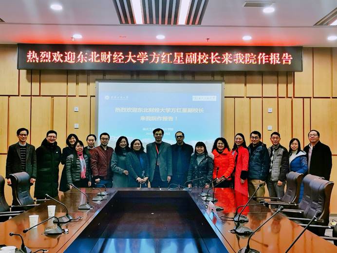 2019年12月19日下午,学院借学校“财经高校校长论坛”之机,邀请了东北财经大学副校长、会计学专业教指委委员方红星教授到我院作了关于学科专业课程建设的报告。报告会在图书馆第五会议室召开,由副院长黄辉主持,学院分党委书记罗惠玉、副院长程文莉、全体系主任、MPAcc与MAud教育中心主任、国际项目部主任、学团办主任、综合办副主任以及相关教师代表共30余人参加了此次会议。